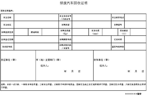 根據《報廢汽車(chē)回收管理辦法》(國務(wù)院令第307號)、《財政部、商務(wù)部、中宣部、國家發(fā)展改革委、工業(yè)和信息化部、公安部、環(huán)境保護部、交通運輸部、工商總局、質(zhì)檢總局關(guān)于印發(fā)<汽車(chē)以舊換新實(shí)施辦法>的通知》(財建[2009]333號)的有關(guān)規定,現將啟用新《報廢汽車(chē)回收證明》有關(guān)事宜通知如下: