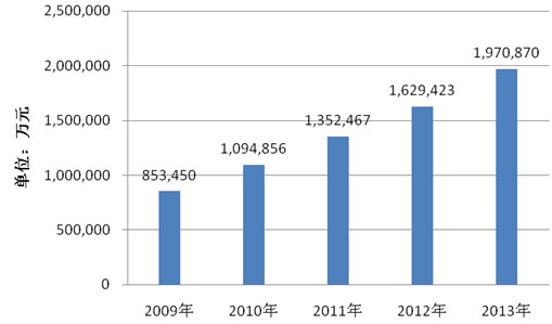 路面保潔作業(yè)車(chē)的有效使用年限通常是7年,據此推算2009年末市場(chǎng)容量是853,450萬(wàn)元,同理預計2010-2013年的年末市場(chǎng)存量見(jiàn)圖3,路面保潔作業(yè)車(chē)年末市場(chǎng)存量將保持著(zhù)年23%的速度遞增。