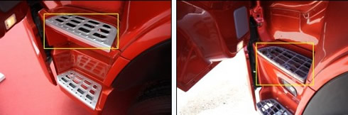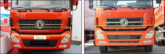 新天龍前面板與保險杠之間多了一條橡膠條,行駛中可以起到防蟲(chóng)的作用。新天龍則少了之前老天龍保險杠上的踏板,一定程度上可能美觀(guān)了,但是在上高方面則大大降低了實(shí)用性。