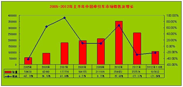 2012年上半年公路牽引車(chē):6月完成產(chǎn)銷(xiāo)10839輛和13804輛;同比下降了19.38%、15.28%,環(huán)比下降18.63%、1.67%;1~6月份,生產(chǎn)量累計104664輛,同比下降18.81%;累計銷(xiāo)售量107832輛,較去年同期(137608輛)下降21.64%。對牽引車(chē)銷(xiāo)售數據判斷,物流市場(chǎng)雖然增速明顯下滑,但整體市場(chǎng)需求有固定需求,因此,牽引車(chē)市場(chǎng)成為重卡市場(chǎng)中,下滑速度相對較小的車(chē)型。