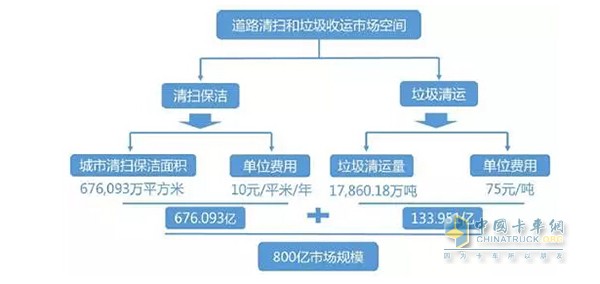 根據國家統計局統計數據,截至2014年底,全國城市道路面積達683,028萬(wàn)平方米,城市清掃保潔面積達676,093萬(wàn)平方米,生活垃圾清運量達17,860.18萬(wàn)噸,糞便清運量1,551.97萬(wàn)噸。按照10元/平米/年的清掃保潔費用和75元/噸的垃圾清運費用,全國市政環(huán)衛市場(chǎng)保守估計市場(chǎng)規模達到800億元,如果算上居民院區、工業(yè)園區等私有領(lǐng)域的環(huán)衛市場(chǎng),整個(gè)道路清掃和垃圾收運是一個(gè)接近千億級的市場(chǎng)。