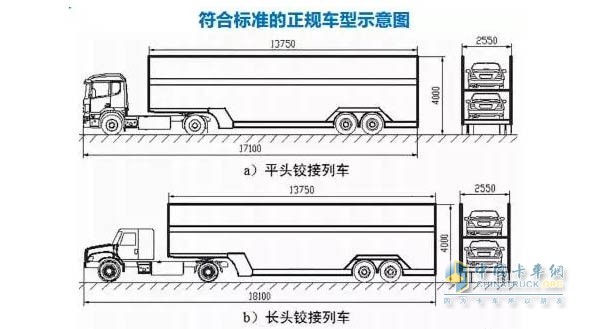 為提升運營(yíng)效率,使國內汽車(chē)標準與國際標準接軌,即將公布的新版GB1589中,增加了中置軸轎運車(chē),并對合規車(chē)型的尺寸進(jìn)行了詳細規定。