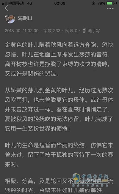 以上是李海明在跑車(chē)休息之余所作,從這些文字怎么也看不出他只有小學(xué)五年級的文憑,這或許是跑運輸這么多年,走過(guò)的路,碰到的事情與人,給了他很多創(chuàng )作的素材,再加上自己愛(ài)好文學(xué)的緣故,字里行間透著(zhù)對生活的思考,希望他能一直堅持下去。