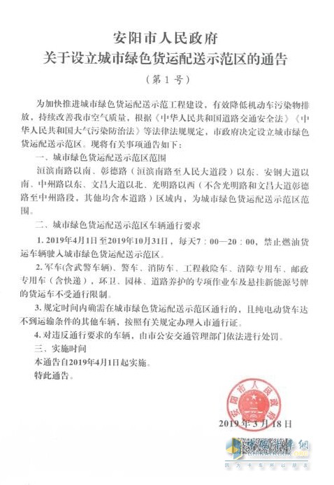 安陽(yáng)市人民政府在2019年3月18日發(fā)布了《關(guān)于設立城市綠色貨運配送示范區的通告》,通知表示,城市綠色貨運配送示范區禁止燃油貨車(chē)駛入,純電動(dòng)貨車(chē)及其他車(chē)輛需達到運輸條件,方可通行。