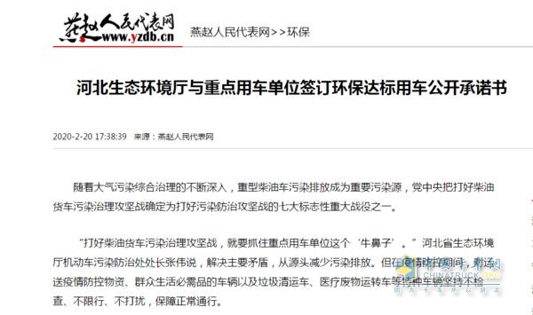 河北生態(tài)環(huán)境廳與重點(diǎn)用車(chē)單位簽訂環(huán)保達標用車(chē)公開(kāi)承諾書(shū),加強對重型柴油車(chē)的相關(guān)治理。承諾書(shū)包括:進(jìn)出單位的所有重型柴油車(chē)、重型燃氣車(chē)達到國五及以上排放標準。