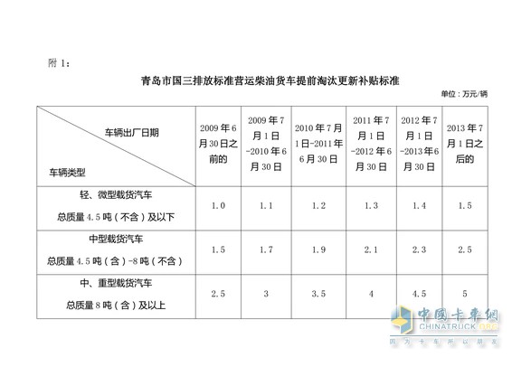 在青島市南區、市北區、李滄區、嶗山區、城陽(yáng)區(含青島高新區)、西海岸新區注冊登記營(yíng)運手續的國三排放標準營(yíng)運柴油貨車(chē)。