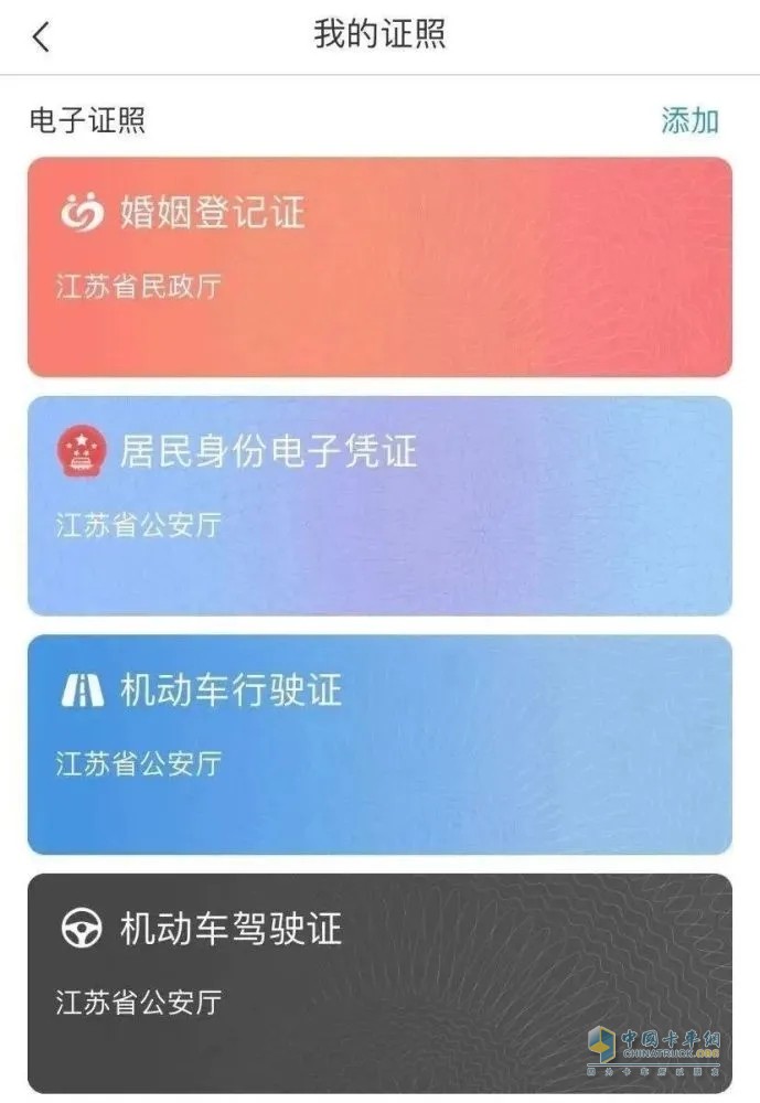 還未領(lǐng)取“電子證照”的駕駛員,可登錄“江蘇政務(wù)服務(wù)”APP,在“我的”頁(yè)面選擇“我的證照”,進(jìn)入頁(yè)面后點(diǎn)擊“添加”,選擇“機動(dòng)車(chē)駕駛證”或“機動(dòng)車(chē)行駛證”,選擇后根據頁(yè)面提示進(jìn)行操作即可。