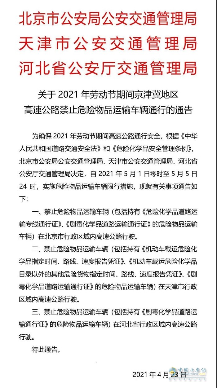 為確保2021年勞動(dòng)節期間高速公路通行安全,根據《中華人民共和國道路交通安全法》和《危險化學(xué)品安全管理條例》,北京市公安局公安交通管理局、天津市公安交通管理局、河北省公安廳交通管理局決定,自2021年5月1日零時(shí)至5月5日24時(shí),實(shí)施危險物品運輸車(chē)輛限行措施。