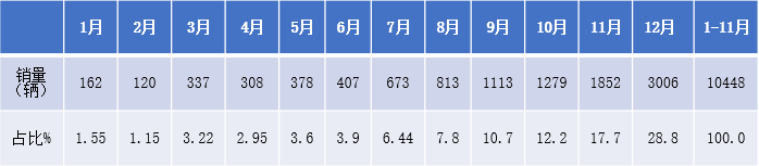 表1 , 2021年1-12月各月新能源重卡銷(xiāo)量及占比(數據來(lái)源:終端上牌信息)