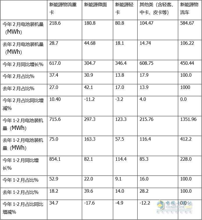 表2,2022年2月及1-2月新能源物流車(chē)各細分市場(chǎng)電池裝機量及同比(數據來(lái)源:終端上牌信息、電池資源)
