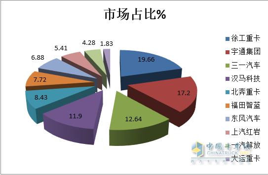 特點(diǎn)四: 徐工重卡、宇通集團、三一汽車(chē)居前三;TOP10累計占比超95%