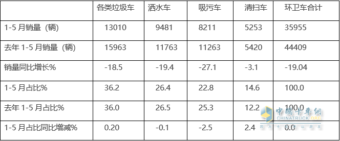 上表顯示,今年1-5月各類(lèi)環(huán)衛車(chē)銷(xiāo)量及占比呈現以下特點(diǎn):