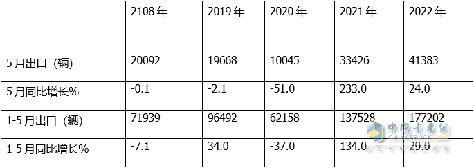 根據海關(guān)出口數據,2022年5月、1-5月與近年同期我國卡車(chē)同期出口比較:
