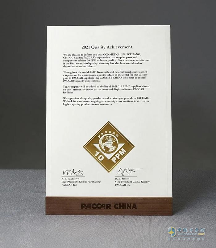 康邁能夠獲得這一殊榮,彰顯了 PACCAR (佩卡) 對康邁的高度認可,更體現了康邁對于“品質(zhì)源于設計、開(kāi)發(fā)策劃,穩健工藝,內建品質(zhì)”這些重要的運營(yíng)管理原則的深度踐行,充分理解和執行PACCAR (佩卡) 嚴格質(zhì)量理念,致力達到高質(zhì)量標準。