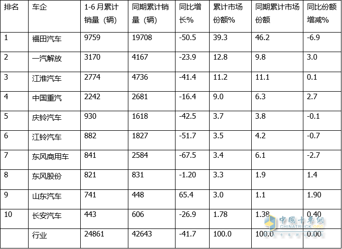 總體看,今年上半年福田汽車(chē)獨大霸榜,一汽解放和江淮汽車(chē)分別居第二、第三;TOP10同比1增9減,山東汽車(chē)是唯一同比正增長(cháng)的車(chē)企;市場(chǎng)份額同比6增4減,一汽解放份額增加最多,表現搶眼。