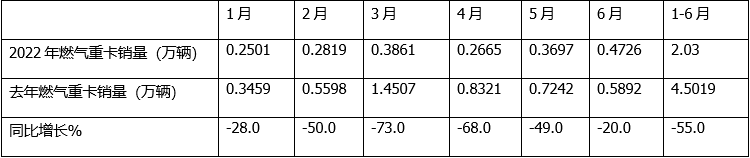 表1,根據終端上牌數據,2022年上半年1-6月各月燃氣重卡銷(xiāo)量及同比情況: