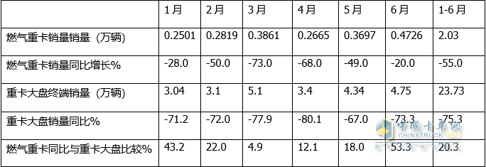 ---1-6月燃氣重卡同比增速累計跑贏(yíng)重卡大盤(pán)20.3個(gè)百分點(diǎn);