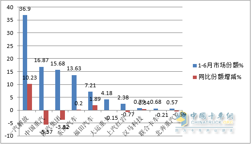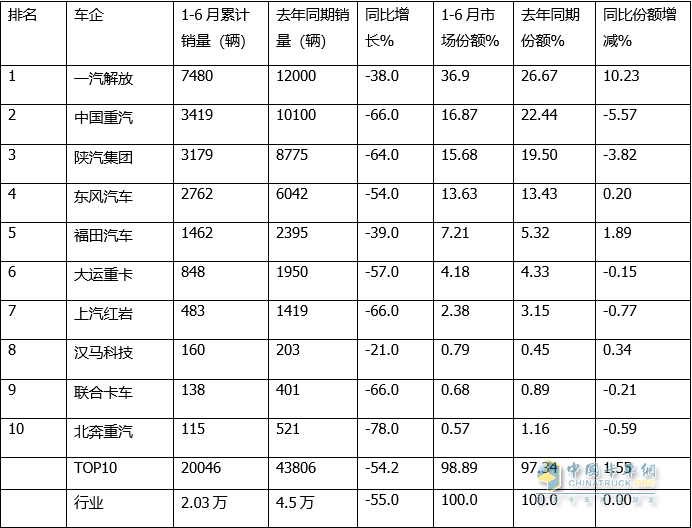 ----top10銷(xiāo)量同比全部下降,市場(chǎng)份額同比4增6降,其中增加最多的是一汽解放,表現最搶眼。