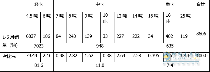 ---中卡型累計銷(xiāo)售948輛,占比11%,其中12噸車(chē)型銷(xiāo)售227輛,占比2.64%,14噸車(chē)型銷(xiāo)量222輛,占比2.58%,分別居中卡車(chē)型第一和第二;
