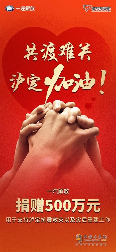 2022年9月7日,一汽解放向四川省慈善聯(lián)合總會(huì )捐贈500萬(wàn)元,用于支援四川甘孜瀘定抗震救災以及災后重建工作。