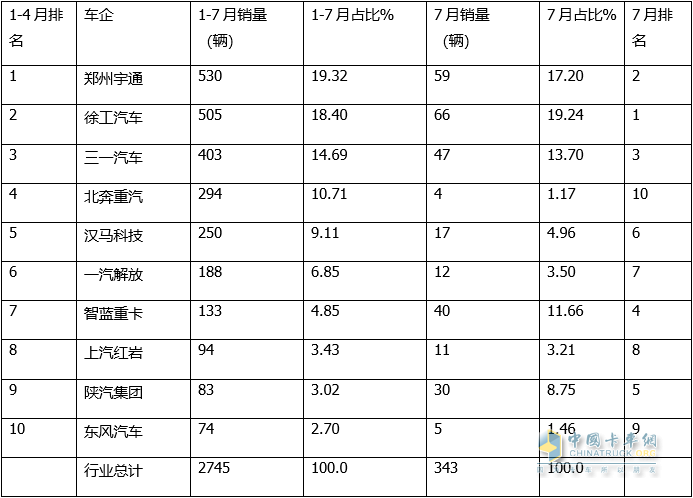 ---7月單月銷(xiāo)量中,徐工汽車(chē)銷(xiāo)售66輛,占比近2成(19.24%),居于第一;第二是鄭州宇通,銷(xiāo)售59輛,占比17.2%;第三是三一汽車(chē),銷(xiāo)售47輛,占比13.7%;第四是智藍重卡銷(xiāo)售40輛,占比11.66%;第五是陜汽集團銷(xiāo)售30輛,占比8.75%;其余車(chē)企銷(xiāo)量均在20輛以下,占比均小于5%。
