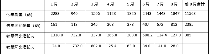 1月同比暴漲1318%,為前3月漲幅最高的月份,2月同比大漲732%,3月同比大漲337%,4月同比大漲265%,5月同比大漲近4倍(383%),但前4月各月同比漲幅呈現明顯的逐月收縮態(tài)勢,這一態(tài)勢在5月被遏制住了(5月的同比增幅為383%,比4月的265%的同比增幅高118個(gè)百分點(diǎn));6月銷(xiāo)量達到2443輛,創(chuàng )下今年上半年新高,且同比大漲500.2%;7月銷(xiāo)量同比114.4%,創(chuàng )1-7月各月增幅新低;8月銷(xiāo)量1847輛,同比增127%,比7月擴大了13個(gè)百分點(diǎn)。