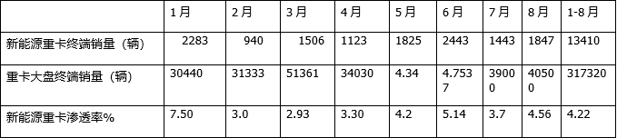 上表可見(jiàn),今年前8月新能源重卡市場(chǎng)滲透率為4.22%,具體到各月又呈現出忽高忽低的特點(diǎn)。其中1月滲透率為7.5%。居前7月各月新高,8月滲透率4.56%,居1-8月各月份第三。