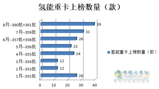 二是最近幾個(gè)月供給端的車(chē)企布局的燃料電池重卡產(chǎn)品越來(lái)越多,為市場(chǎng)端提供了更豐富的產(chǎn)品選擇(今年6月、7月、8月上榜的燃料電池重卡車(chē)型數量均創(chuàng )今年以來(lái)各月新高),一定程度上促進(jìn)了今年8月燃料電池重卡的銷(xiāo)量。這個(gè)從近幾個(gè)月工信部發(fā)布的公告中上榜的氫能重卡車(chē)型數量就能得到驗證(下圖)。