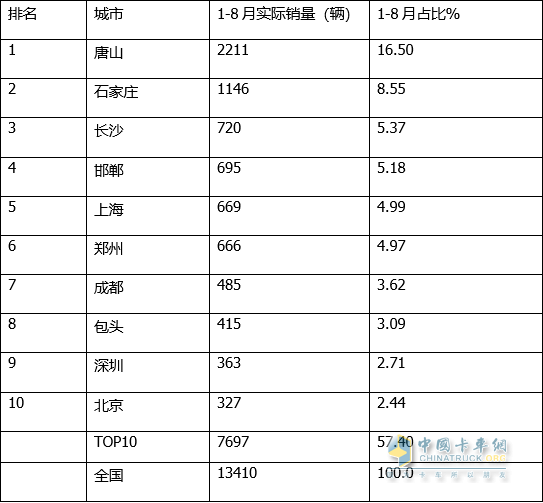上表顯示,今年1-8月新能源重卡銷(xiāo)量TOP10城市中: