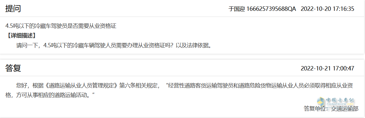 近日,有卡友向交通部提問(wèn):4.5噸以下的冷藏車(chē)駕駛員是否需要從業(yè)資格證?交通部的回復如下: