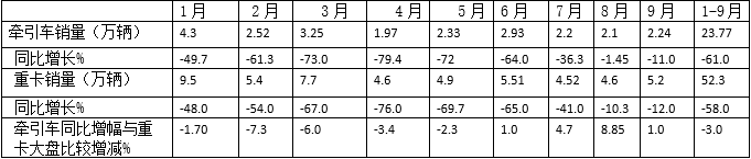 可見(jiàn),無(wú)論是今年9月還是1-9月,今年的牽引車(chē)市場(chǎng)均是最低迷的。