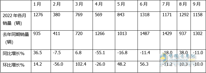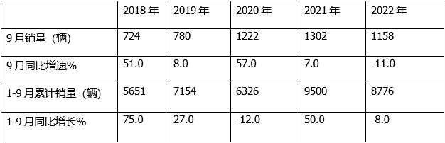 上表可見(jiàn),在近5年的9月的房車(chē)銷(xiāo)量中,2022年9月的銷(xiāo)量為1158輛,也是近年同期第三次銷(xiāo)量超過(guò)1000輛的月份,居第三,處于中等水平,同比增長(cháng)-11%,增幅居近年同期最低。