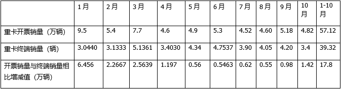 上表顯示,今年前10月各月的重卡的開(kāi)票銷(xiāo)量數據均大于終端實(shí)際銷(xiāo)量: