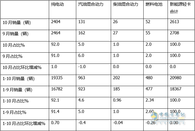 上表顯示,在2022年1-10月新能源輕卡銷(xiāo)量中: