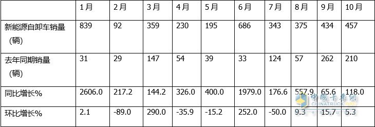 上表顯示,今年1-10月新能源自卸車(chē)累計銷(xiāo)售4010輛,同比增長(cháng)3倍多(308%),領(lǐng)漲1-10月新能源重卡大盤(pán)。