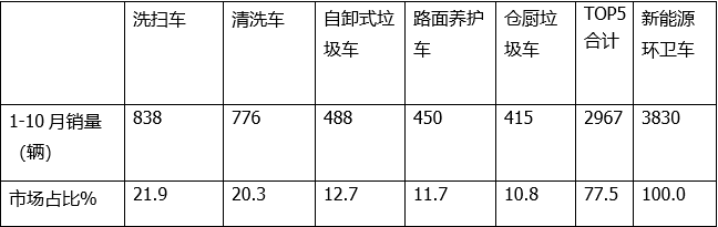 ---top5新能源環(huán)衛車(chē)累計銷(xiāo)售2967輛,市場(chǎng)占比近8成(77.5%),占據了今年1-10月新能源環(huán)衛車(chē)市場(chǎng)的絕對主體。