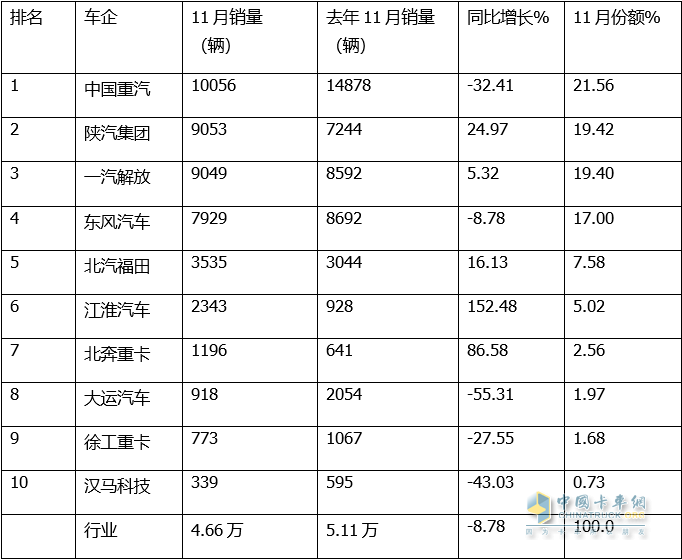 具體到各個(gè)企業(yè),今年11月份重卡市場(chǎng)只有中國重汽1家車(chē)企銷(xiāo)量過(guò)萬(wàn)輛;陜汽集團和一汽解放分別居第二和第三,TOP10同比5增5降,其中江淮汽車(chē)同比漲幅最高;