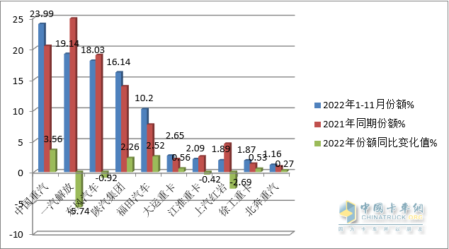 上圖表顯示,2022年前11月重卡企業(yè)銷(xiāo)量TOP10同比、市場(chǎng)份額及同比份額增減呈現以下特征: