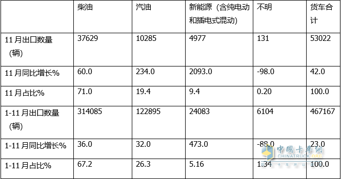 上表可見(jiàn),無(wú)論是2022年11月還是1-11月,柴油貨車(chē)出口數量都是最多的,占比均在7成左右;其次是汽油貨車(chē)(主要是輕卡類(lèi))出口占比(11月占比19.4%,1-11月占比26.3%);再次是新能源(11月占比為9.4%,1-11月占比為5.16%)。而不明類(lèi)車(chē)型占比很小。