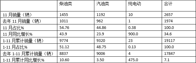 5-6米主體地位減弱,說(shuō)明其他米段的車(chē)型環(huán)比有所增加,其中3.5米—5米段車(chē)型占比環(huán)比增加最多(11月及1-11月占比環(huán)比分別增加了0.5和0.2個(gè)百分點(diǎn))。