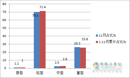 2、2022年11月及1-11月重卡型冷藏車(chē)分別銷(xiāo)售807輛和12125輛,市場(chǎng)占比分別為26.3%和25.8%,可見(jiàn)無(wú)論是11月還是1-11月,重型冷藏車(chē)均居第二,均是冷藏車(chē)市場(chǎng)的次主打車(chē)型。