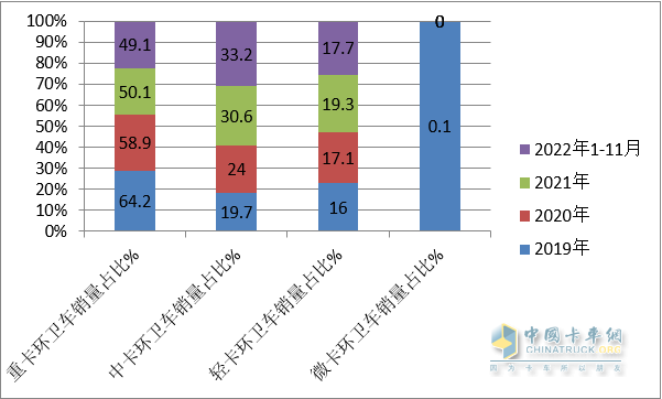 ----重卡類(lèi)環(huán)衛車(chē)占比始終是最大的,但占比呈現逐漸萎縮態(tài)勢,從2019年的64.2%逐年縮小到2022年1-11月的49.1%;
