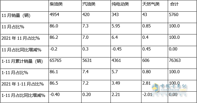 ---2022年11月及1-11月柴油類(lèi)環(huán)衛車(chē)占比分別為86.0%和86.1%,均居于絕對的主體地位,且占比同比分別減少0.2%和0.4%;