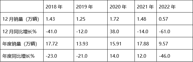 2022年12月中卡銷(xiāo)量為0.57萬(wàn)輛,在近5年12月中居最低,其同比降幅61%,也是近5年中降幅最大的月份;