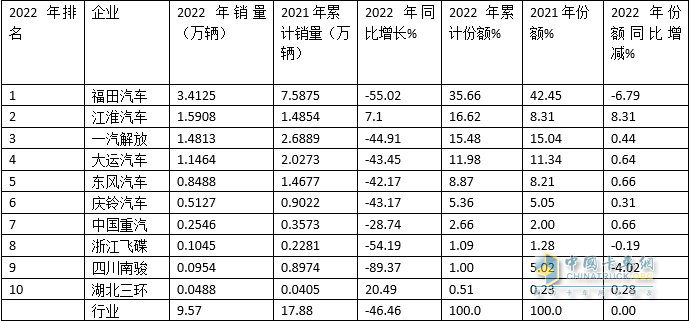 特點(diǎn)五: 2022年累銷(xiāo)福田、江淮、解放居前三;TOP10銷(xiāo)量同比2增8降,江淮領(lǐng)漲;市場(chǎng)份額同比7增3減,江淮汽車(chē)份額增加最多
