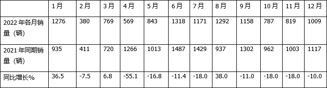 上表可見(jiàn),在近5年的12月的房車(chē)銷(xiāo)量中,2022年12月的銷(xiāo)量為1009輛,是近年同期第二高的月份,處于中上水平,同比增長(cháng)-10%,增幅居近年同期最低。