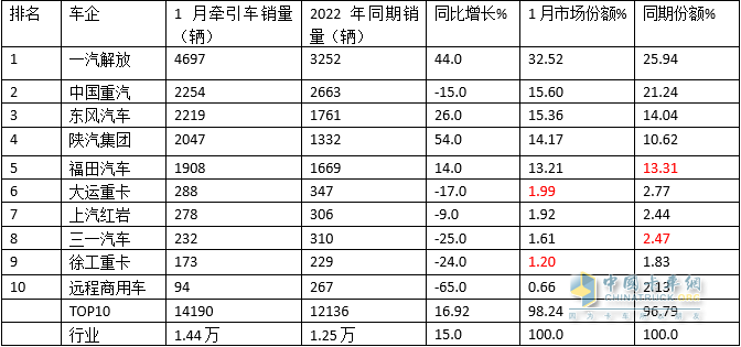 上表顯示,在2023年1月新能源牽引車(chē)市場(chǎng)競爭格局中: