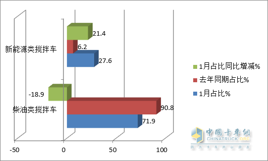 ---新能源攪拌車(chē)累計銷(xiāo)售159輛,逆勢增長(cháng)63.9%,領(lǐng)漲1月攪拌車(chē)市場(chǎng)大盤(pán),占據27.6%的市場(chǎng)份額,居第二,且占比同比增加21.4個(gè)百分點(diǎn),是占比同比增加最多的細分車(chē)型,說(shuō)明目前攪拌車(chē)電動(dòng)化趨勢明顯加快。