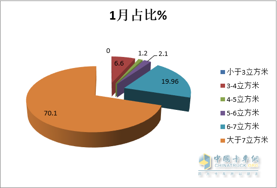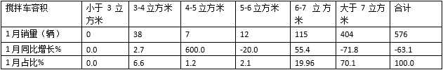---7立方米以上的大容量攪拌車(chē)銷(xiāo)售404輛(同比下降71.8%),市場(chǎng)占比70.1%,居于絕對的主體地位,是今年1月最為暢銷(xiāo)的攪拌車(chē)車(chē)型;主要是因為根據法規,7立方米以上容量的車(chē)型性?xún)r(jià)比最高,更能讓客戶(hù)容易賺錢(qián);