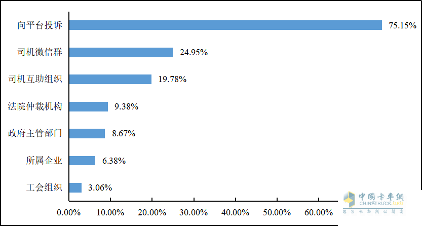 向平臺投訴是司機最主要的糾紛處理方式。75.15%的貨車(chē)司機發(fā)生糾紛后選擇通過(guò)平臺客服渠道進(jìn)行投訴。大部分平臺也建立了完整的客戶(hù)糾紛解決機制,平臺協(xié)調糾紛解決能力逐步提升。也有部分司機會(huì )選擇向加入的司機微信群、司機互助組織等自組織求助。選擇法律程序、政府部門(mén)、工會(huì )組織投訴的占比較低,分別為9.38%、8.67%和3.06%。